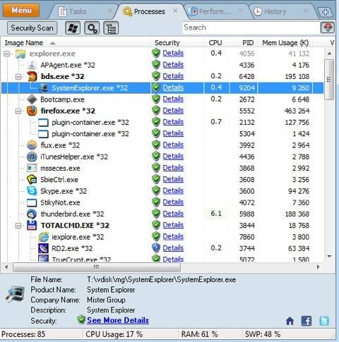System Explorer é uma ferramenta com muitas funcionalidades. Pode ser usada para obter informação detalhada dos processos, programas de arranque, add-ons, serviços do windows, drivers, ligações de rede, e muito mais. Pode ser usada também para fazer scan a ficheiros usando serviços online tais como o VirusTotal e o Jotti. Podemos ver também rapidamente informações do sistema tais como fontes, codecs de audio e vídeo, contas de utilizadores, etc. Certifiquem-se de que fazem download da versão Portable no site do System Explorer.